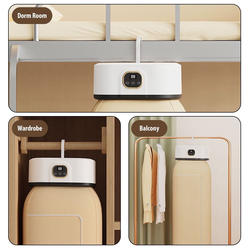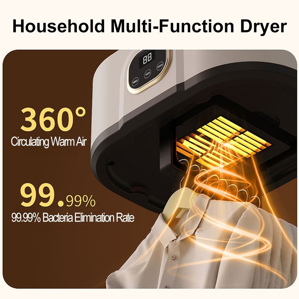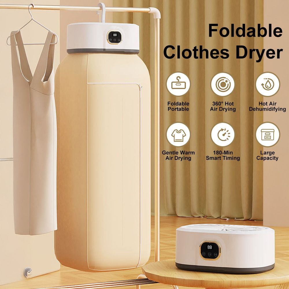 Foldable Hanging Clothes Dryer 1)Dimensions & Design - Dimensions: 95CM/37.40IN (height) × 25CM/9.84IN (width) × 18CM/7.09IN (depth). Features a foldable and portable design with a wave-shaped hook and folding hook, easy to store and install without complex procedures. 2)Performance & Function - Equipped with 360° circulating warm air, providing gentle warm air drying and hot air dehumidifying functions. 3)Operation & Energy Efficiency - Comes with a simple control panel supporting one-touch start and timing functions. Energy-efficient with power consumption under 1 kWh per hour. Ultra-quiet design ensures uninterrupted sleep during operation. 4)Application & Scene - Suitable for various scenarios including dorm rooms, wardrobes, balconies, etc. Ideal for drying clothes in daily household use, especially convenient for small spaces and travel.