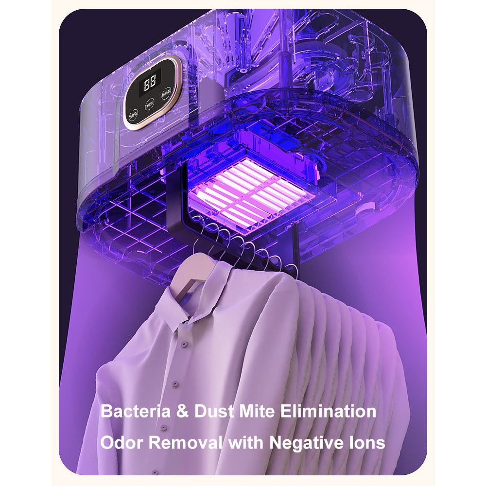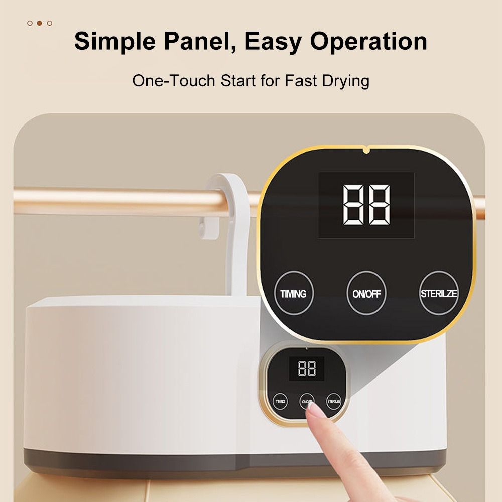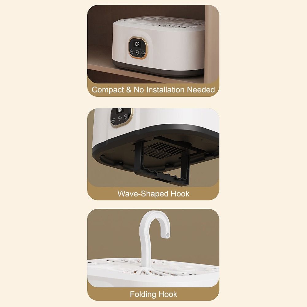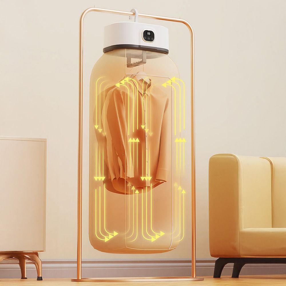 Foldable Hanging Clothes Dryer 1)Dimensions & Design - Dimensions: 95CM/37.40IN (height) × 25CM/9.84IN (width) × 18CM/7.09IN (depth). Features a foldable and portable design with a wave-shaped hook and folding hook, easy to store and install without complex procedures. 2)Performance & Function - Equipped with 360° circulating warm air, providing gentle warm air drying and hot air dehumidifying functions. 3)Operation & Energy Efficiency - Comes with a simple control panel supporting one-touch start and timing functions. Energy-efficient with power consumption under 1 kWh per hour. Ultra-quiet design ensures uninterrupted sleep during operation. 4)Application & Scene - Suitable for various scenarios including dorm rooms, wardrobes, balconies, etc. Ideal for drying clothes in daily household use, especially convenient for small spaces and travel.